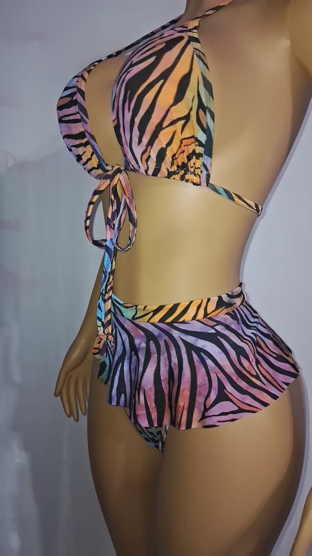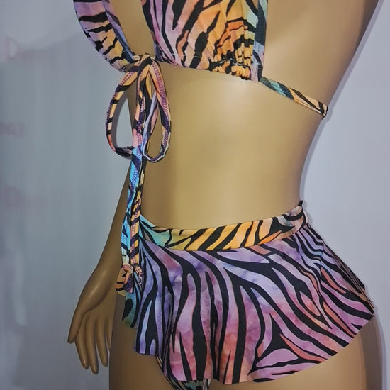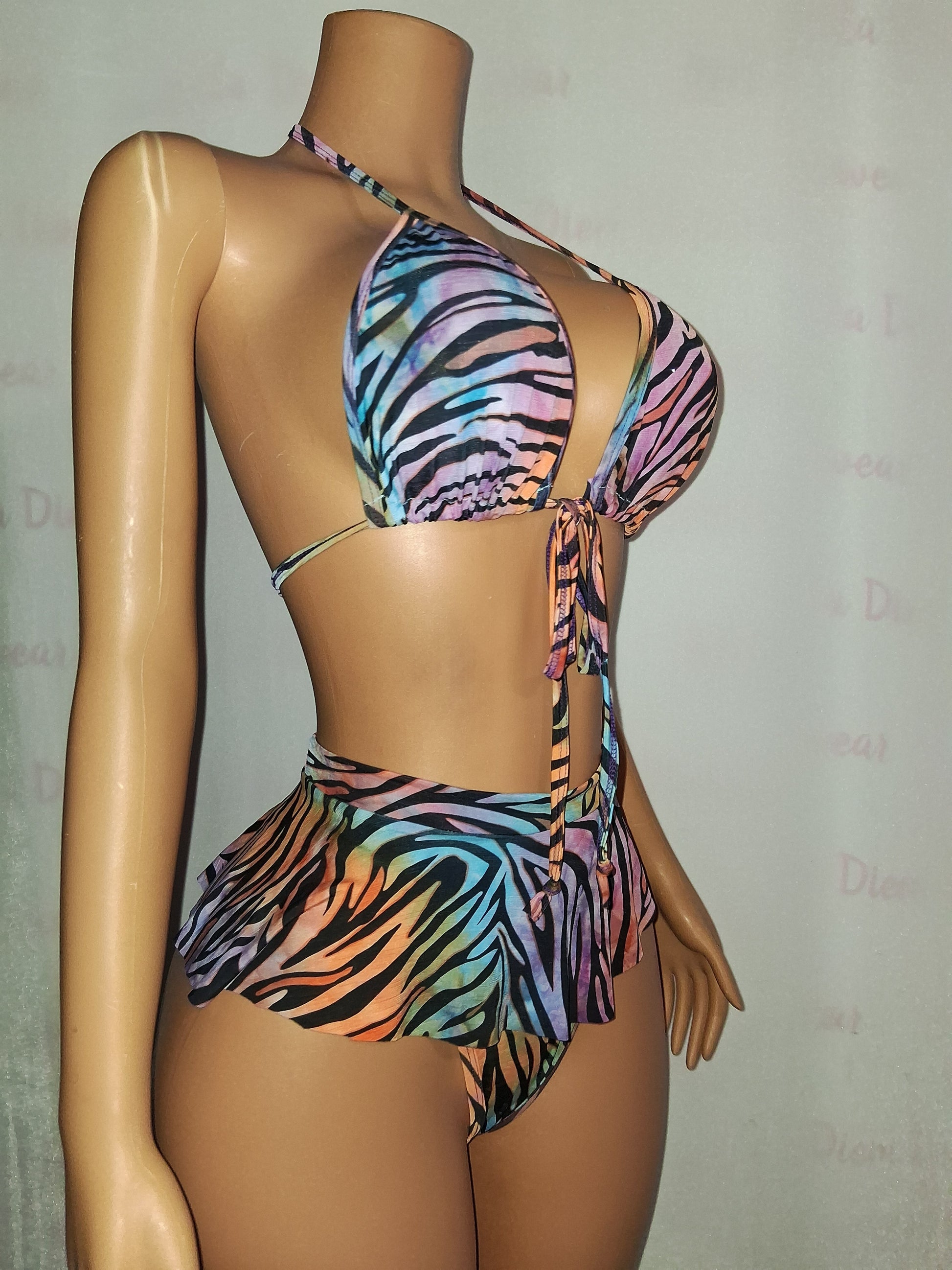 Add some wild flair to your wardrobe with our Animal Print Skirt Set! This set features a vibrant multicolor animal print and is designed to fit waist sizes up to 38 inches. The full coverage triangle bikini top and adjustable G-string panties make for a flirty and girly outfit, perfect for exotic dancers, strippers, ravers, festivals, and lingerie. Order now for same day shipping Monday through Friday!