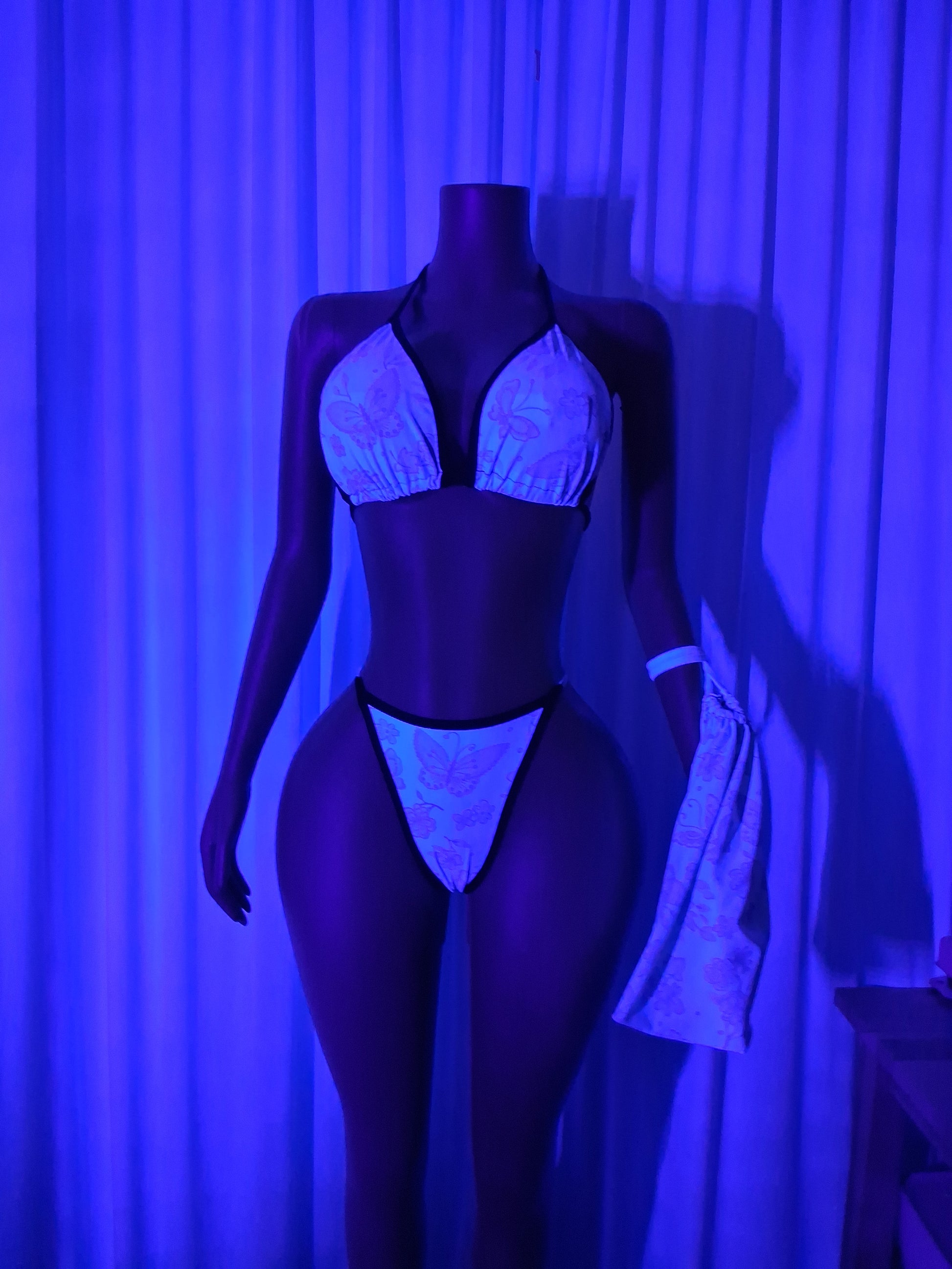 Our Butterfly Print Money Bag Set is perfect for strippers, exotic dancers, and adventurous beach goers. Made with four-way stretch printed spandex, it glows under UV lighting for a striking effect. This set includes a size medium g string and a matching floor moneybag, making you look and feel confident as you dance the night away. Ships next day Monday through Friday, excluding holidays.